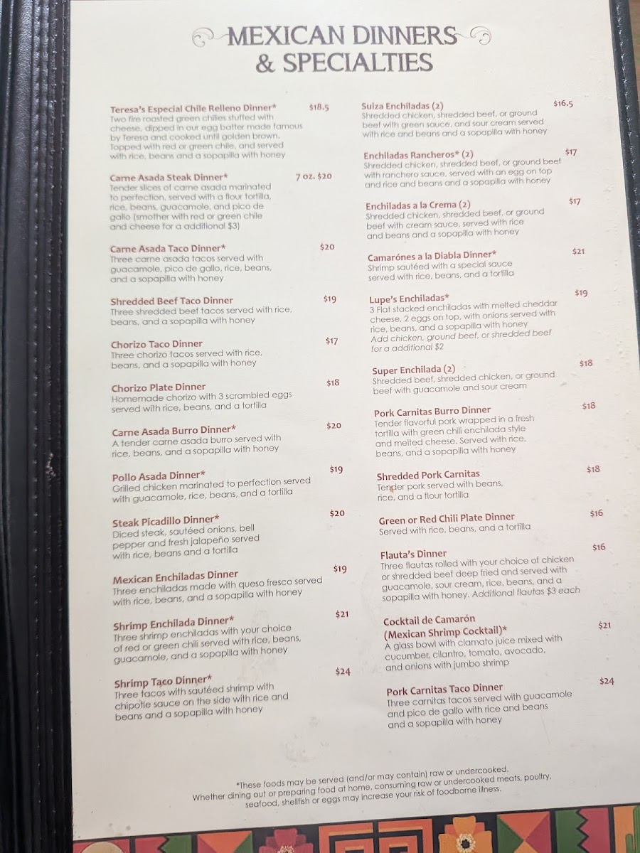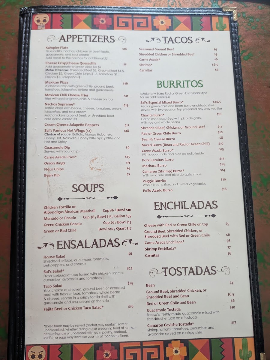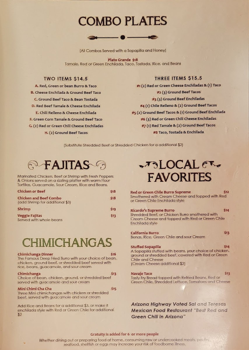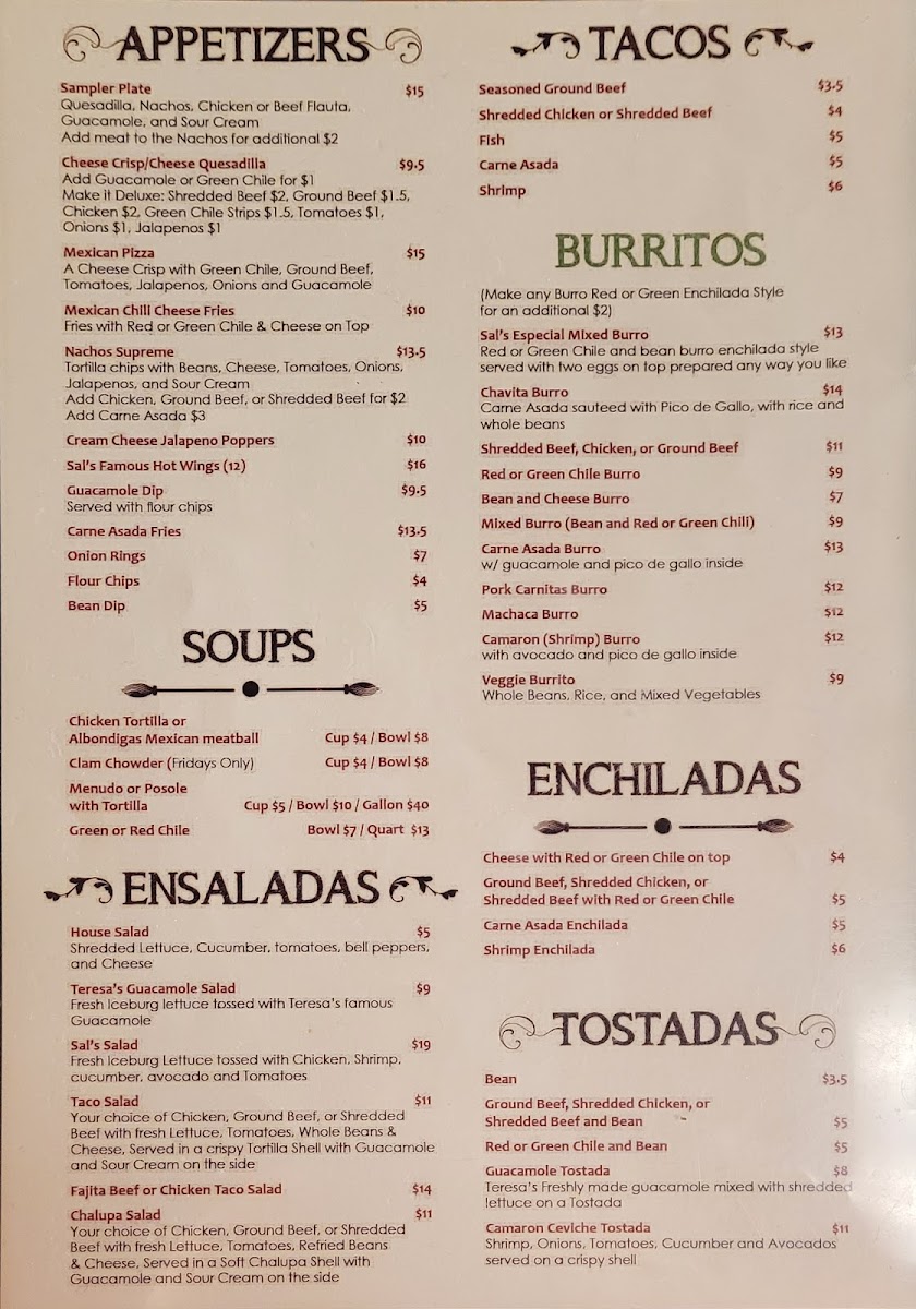 Welcome to Sal & Teresa's Mexican Restaurant, your local culinary gem located at 455 Woodland Rd, Lakeside, AZ. With a standout menu offering everything from savory tacos to hearty dinners, this eatery promises an authentic Mexican experience. Tacos are the highlight, showcasing options like seasoned ground beef starting at just $4.00 and succulent carne asada for $6.00. For those seeking more, delve into delightful entrees such as the Chiles Rellenos or the Carne Asada Steak Dinner, both highly recommended by patrons. The warmth of the staff and their attention to detail enhance every visit, as echoed by numerous satisfied diners. The charming ambiance adds to the character of this older building, offering a cozy dining experience. Each dish is served hot and fresh, making Sal & Teresa's not just a meal, but a memorable culinary experience. Come savor the flavor and jump-start your taste buds!
